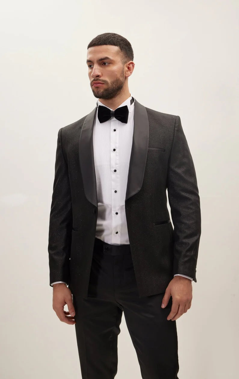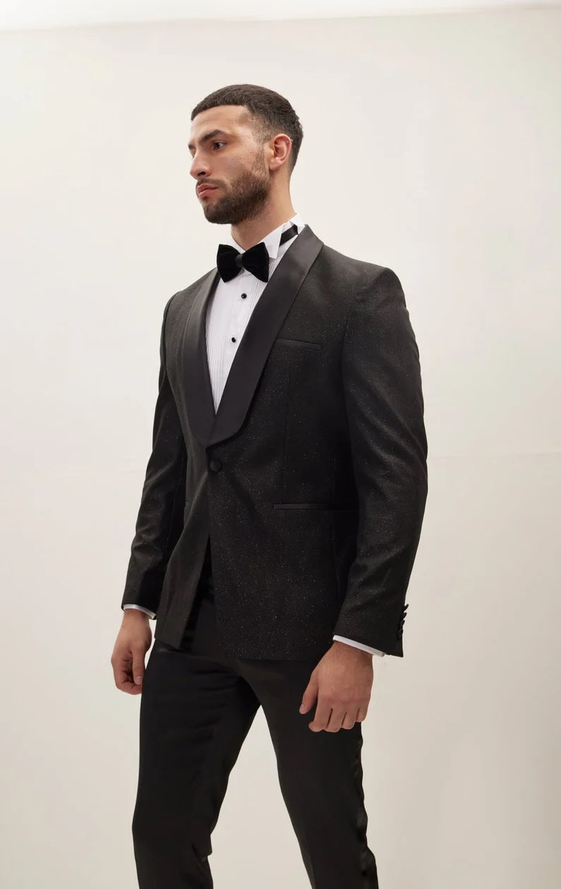 The focal point of this ensemble is its distinctive shawl lapel, exuding timeless charm and sophistication with a modern twist. Adorned with subtle glitter accents, the lapel catches the light just so, adding a touch of subtle glamour to your evening ensemble.