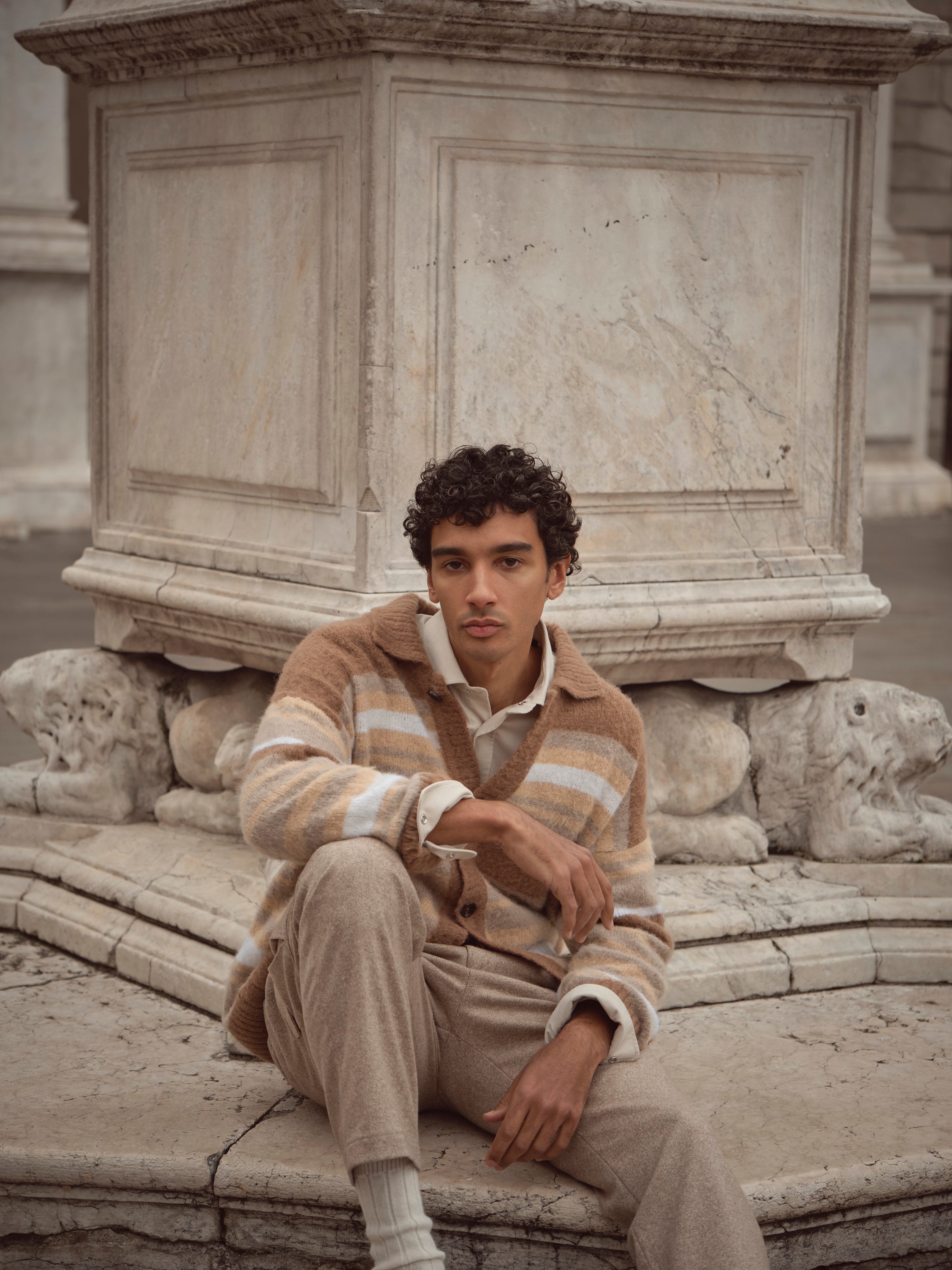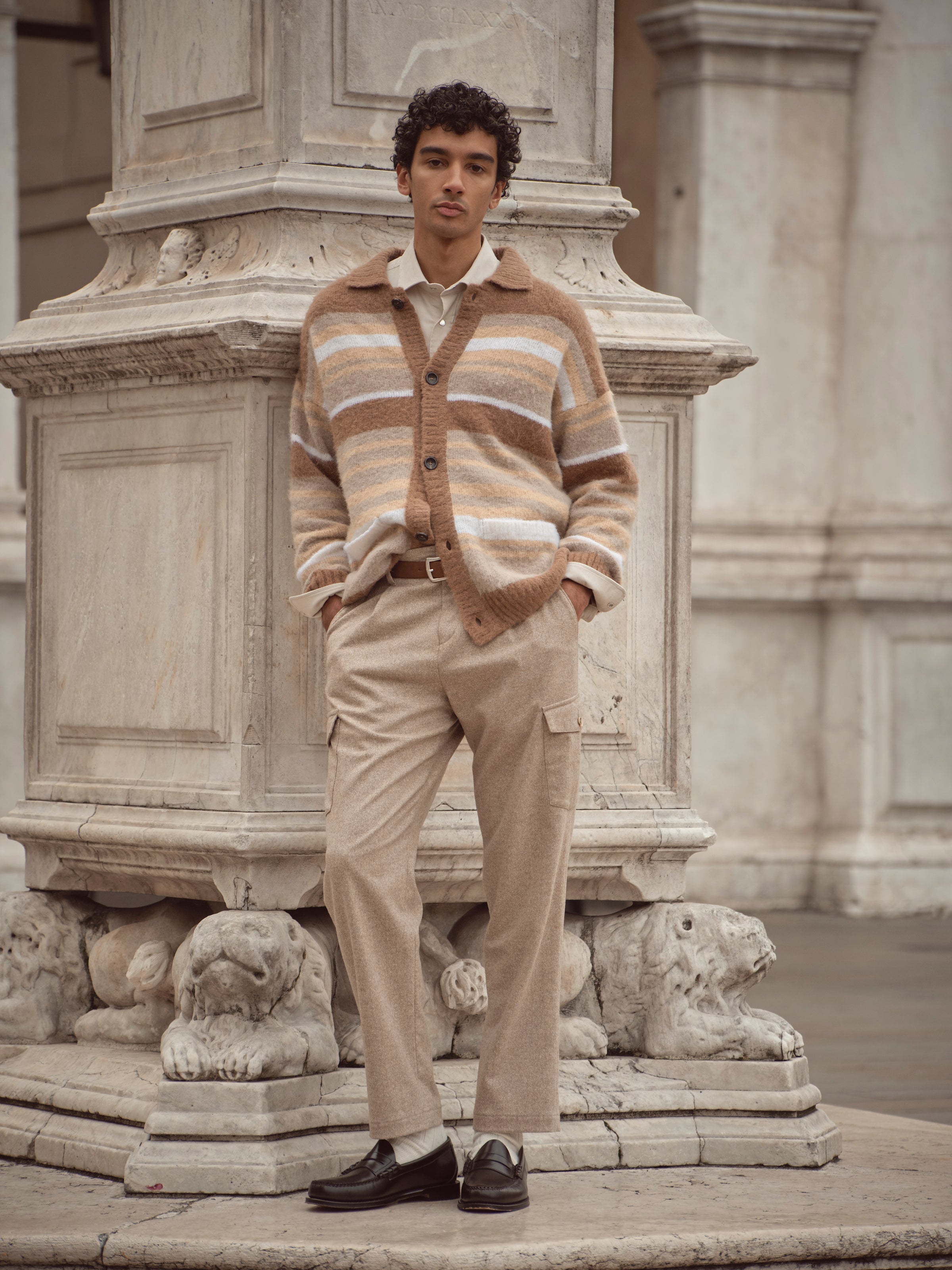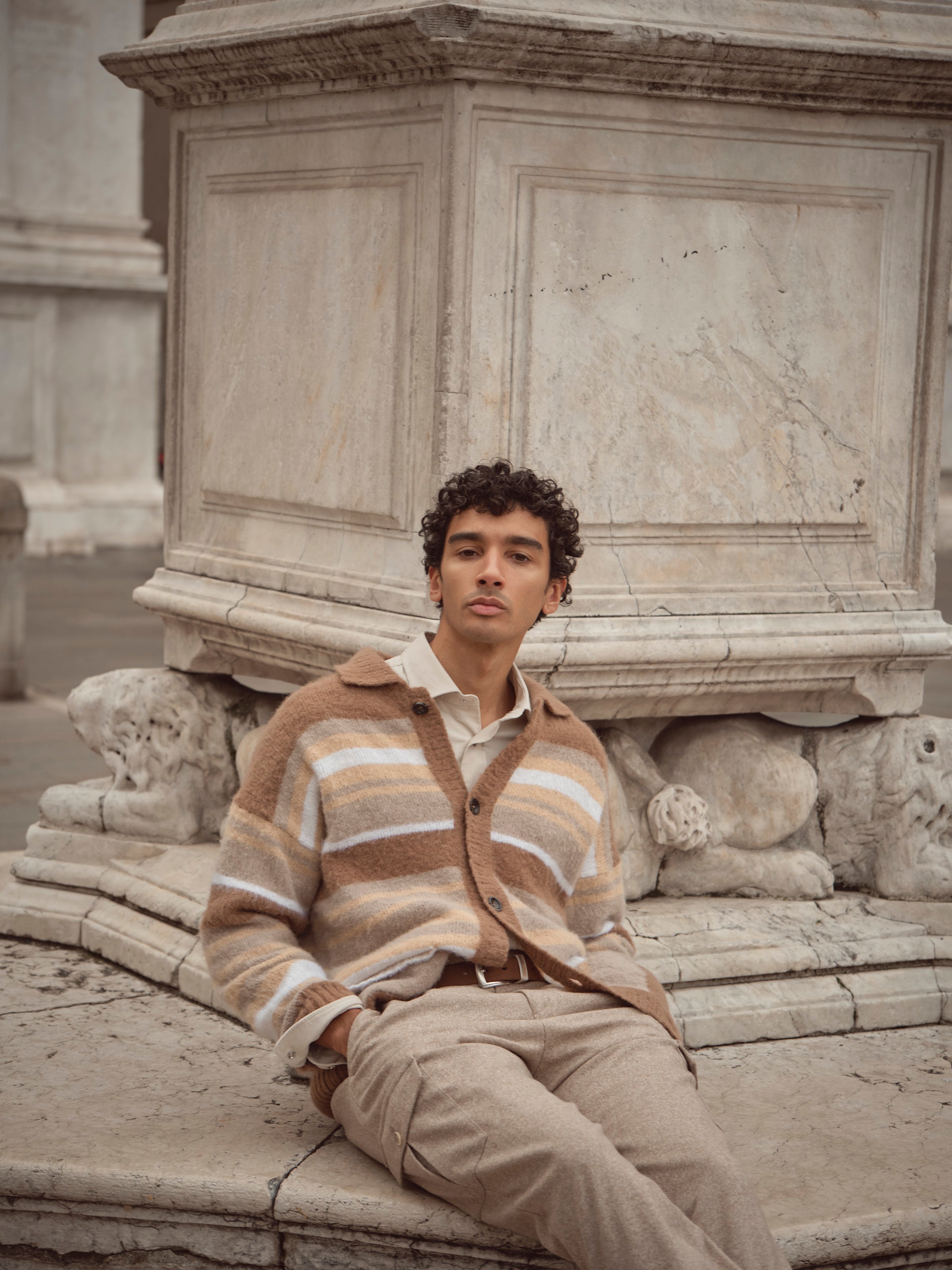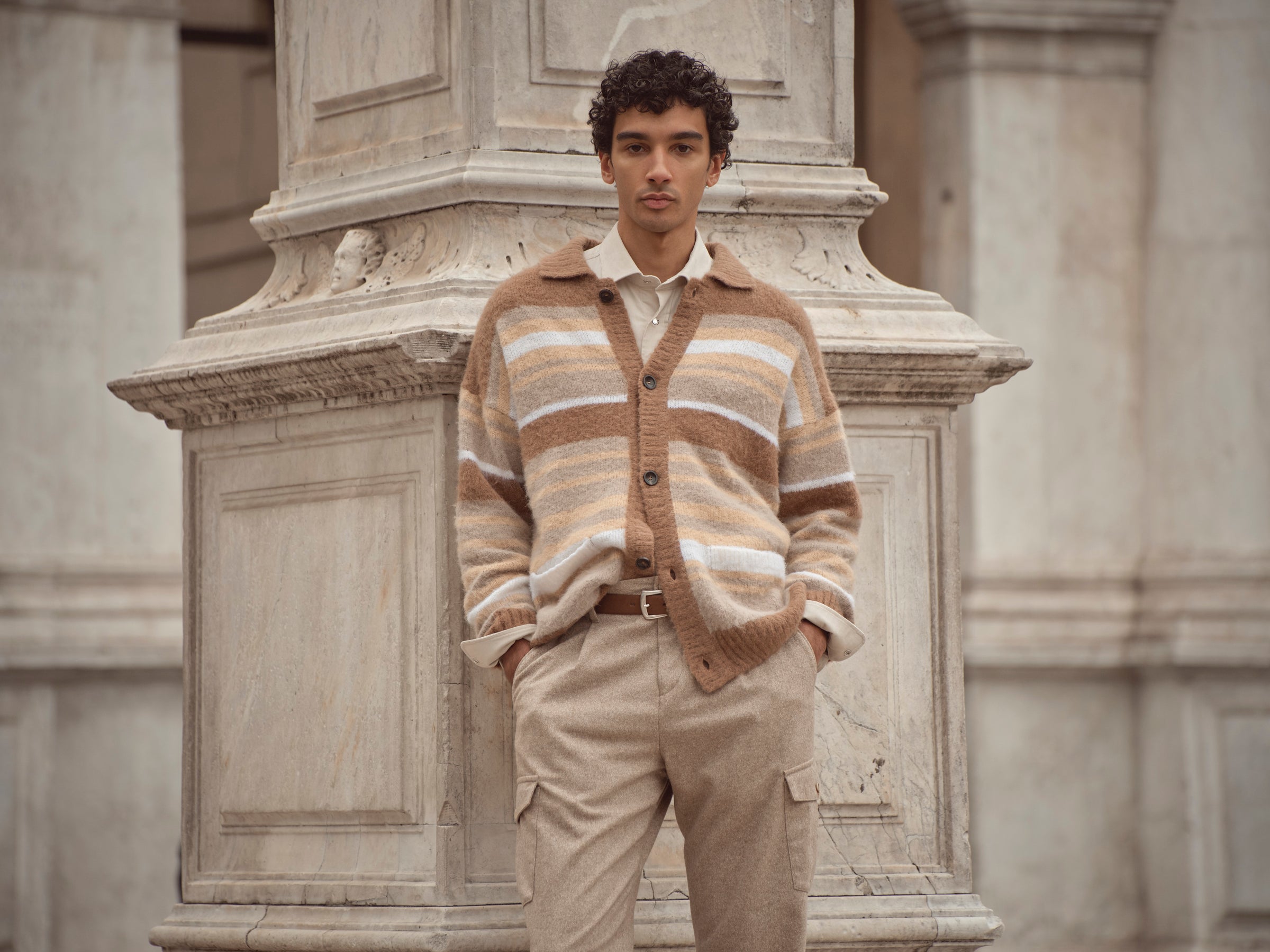 Striped jacket with patch pockets, lightly brushed, turn-down collar, buttons at the front and Bugatti flag label on the left side seam.