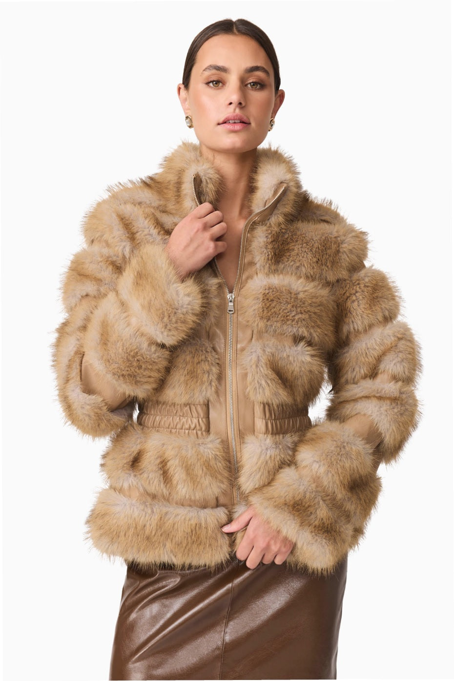 Refined with a touch of edge, this Faux Fur & Leather Jacket in Beige is your statement outerwear for the season. This high neck design combines the plush texture of faux fur fabrication with sleek leather accents, offering a modern contrast that feels both elevated and on-trend.