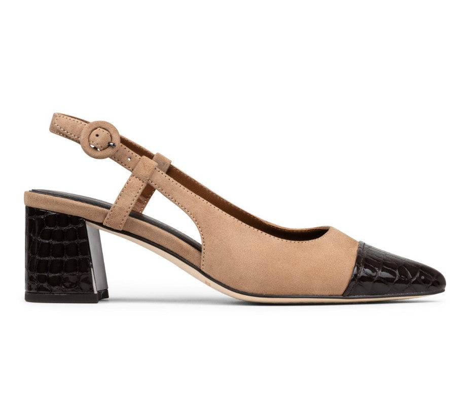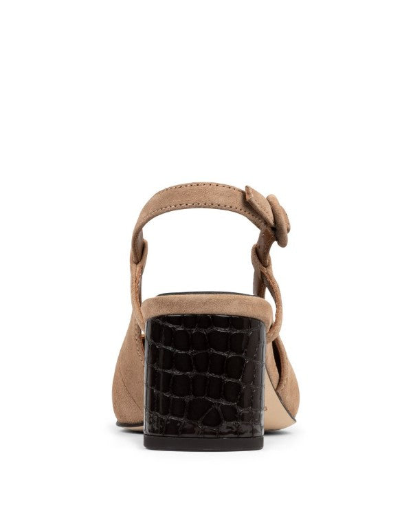A breath of fresh air, this slingback heel in soft oilky suede is a style that takes you from day to night. Its flared block heel, wrapped in embossed croco leather and finished with an electroplated detail, offers the perfect amount of lift with a refined finish. An adjustable buckle strap secures the fit, while a memory foam insole and buffed leather outsole add lasting comfort and ease.