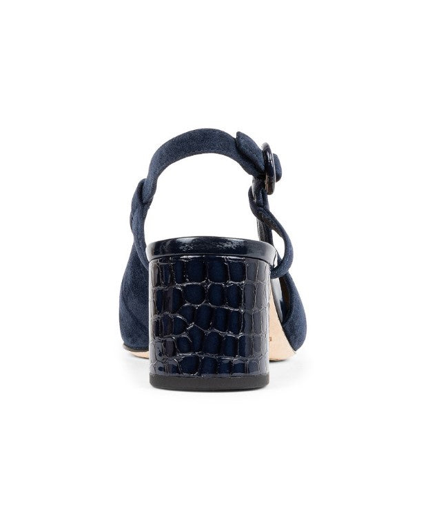 A breath of fresh air, this slingback heel in suede is a style that will take you from day to night. Its block heel covered in snake print leather and accented by electroplated detail gives you the perfect amount of height yet keeps you comfortable on your feet. A memory foam padded insole and buffed leather outsole add to the ease of this sophisticated shoe. Finished with an adjustable buckle closure.