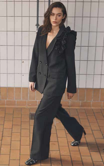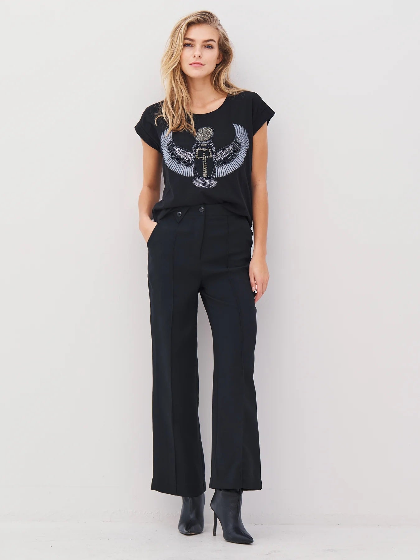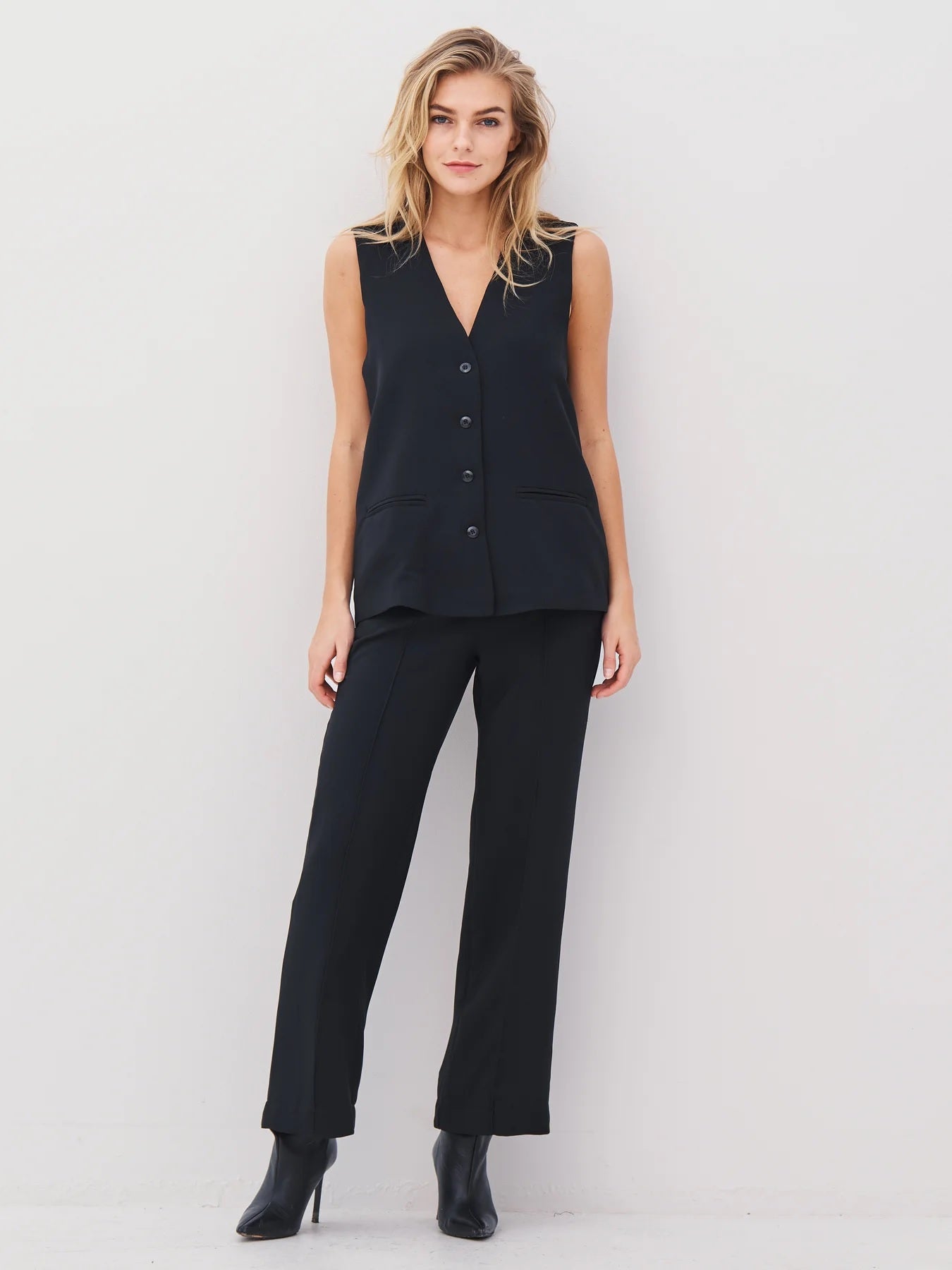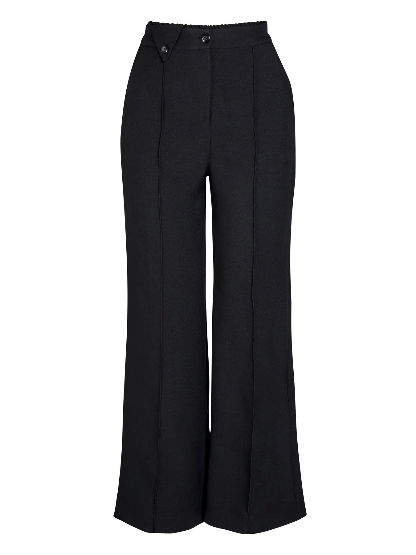 The trousers have a straight, loose fit with front pleats, giving a classic and stylish expression. They fasten with two asymmetrically placed buttons, adding a modern twist. The elastic at the back ensures a comfortable fit and makes them easy to wear all day. The lightly mottled material supports the elegant look without feeling stiff.