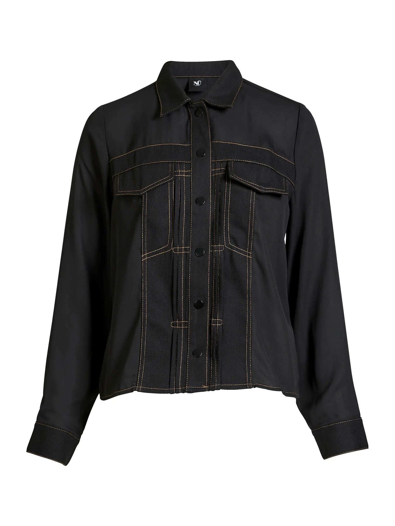 This denim shirt combines a classic cut with modern details. It features a button closure at the front, chest pockets with flaps, and distinctive contrast stitching that highlights the design's structure. The material is light and soft, making the shirt comfortable for both layering and wearing alone as a light jacket.