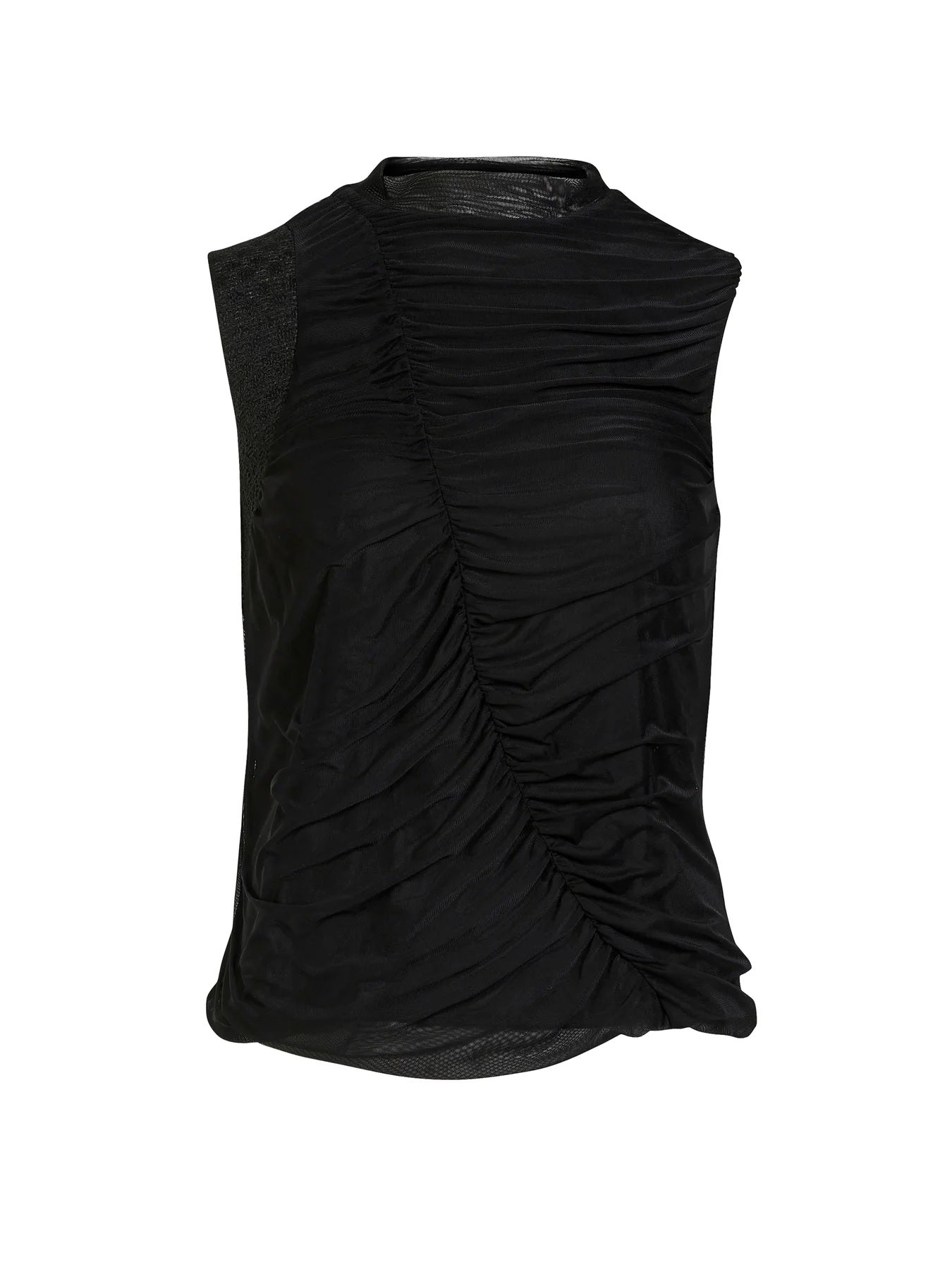 A modern twist on the classic top - this sleeveless style stands out with its bold, diagonal ruched design both in the front and back. A shiny detail at the neckline adds edge, while the lightly sheer mesh structure gives a sophisticated look. The form-fitting silhouette makes it ideal under a blazer or on its own as a statement piece.