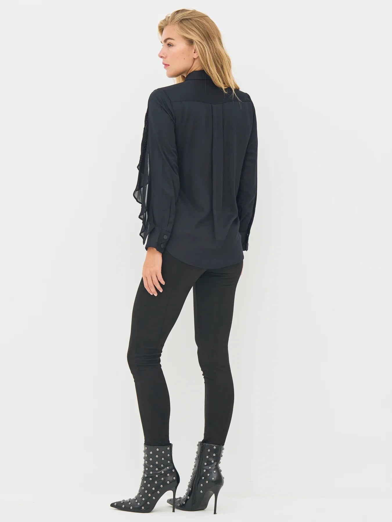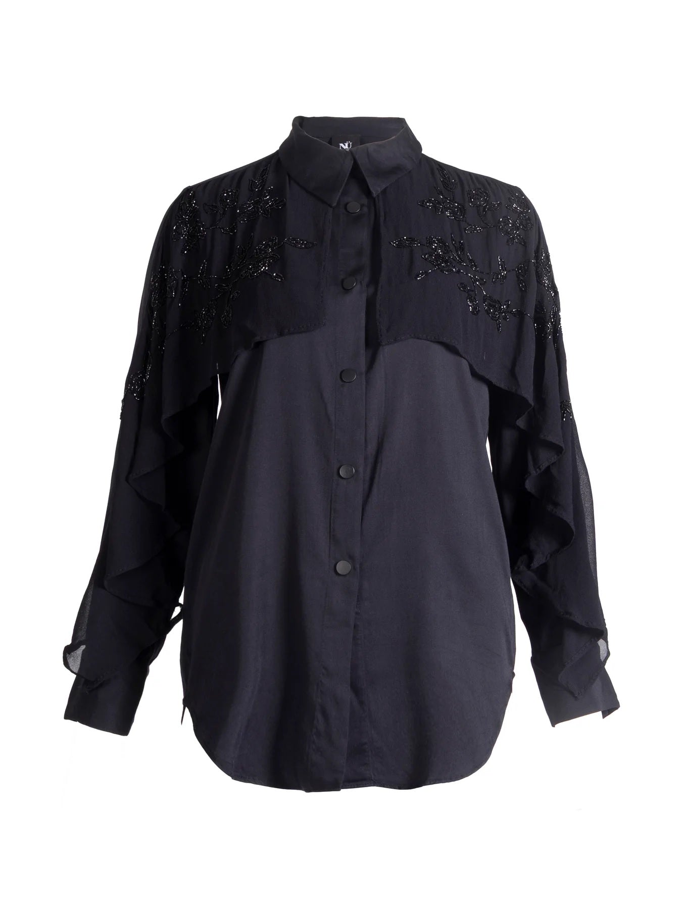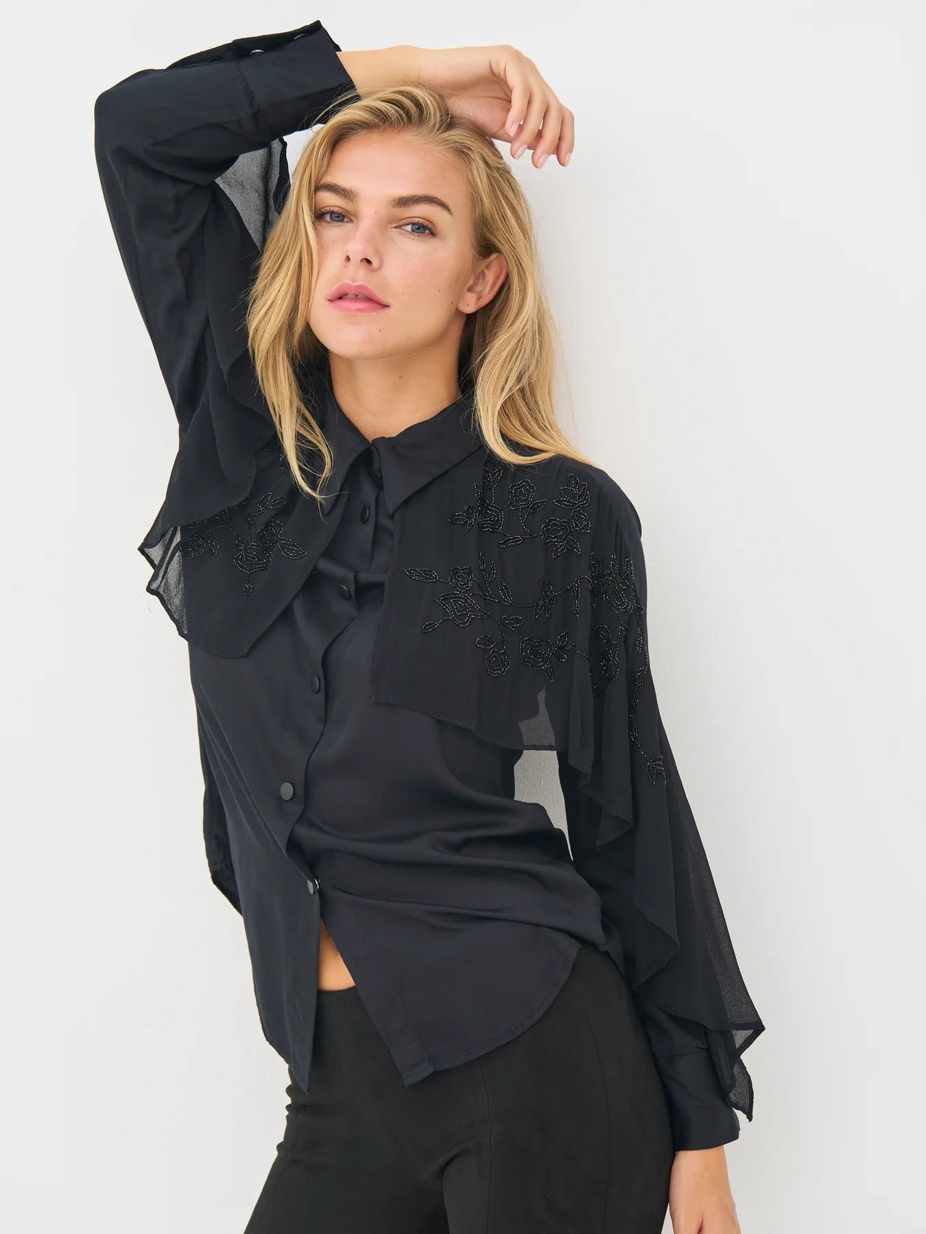 This shirt combines classic shirt design with decorative and feminine details. The top is embellished with tone-on-tone embroideries and small pearls, creating a sophisticated look. The shirt has long sleeves with cuffs and button closure, as well as light, flowing ruffles along the shoulder area, adding movement and character. The full-length button closure allows for versatile styling.
