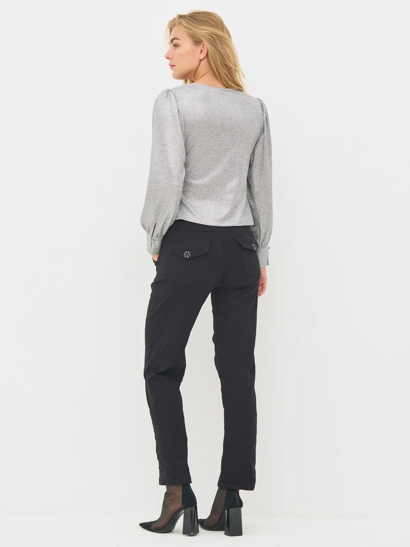 Stand out with this eye-catching wrap blouse with a subtle metallic sheen. It features a flattering V-neckline and an elegant tie belt at the waist, highlighting the figure. The long sleeves are finished with cuffs for a classic look, while the fabric's shiny texture adds a modern twist.