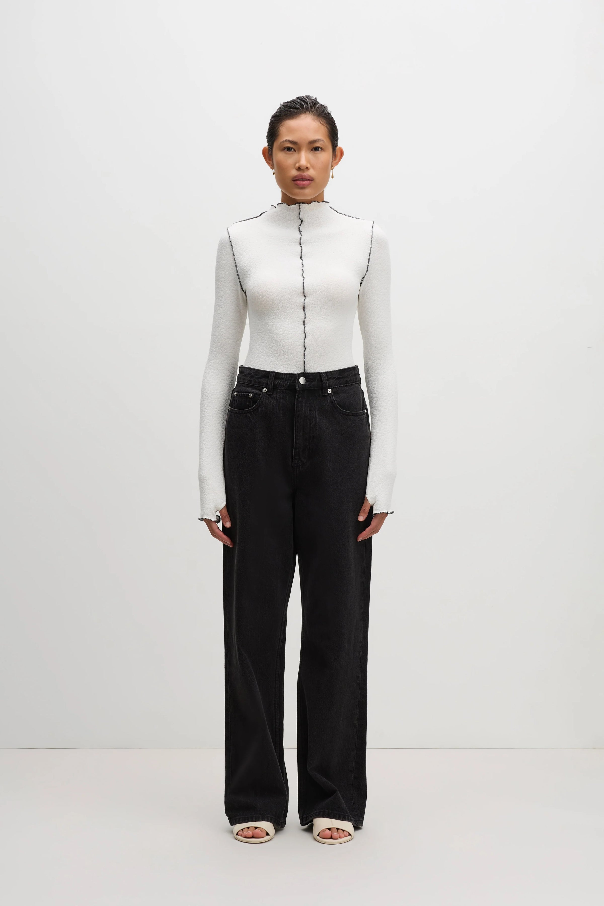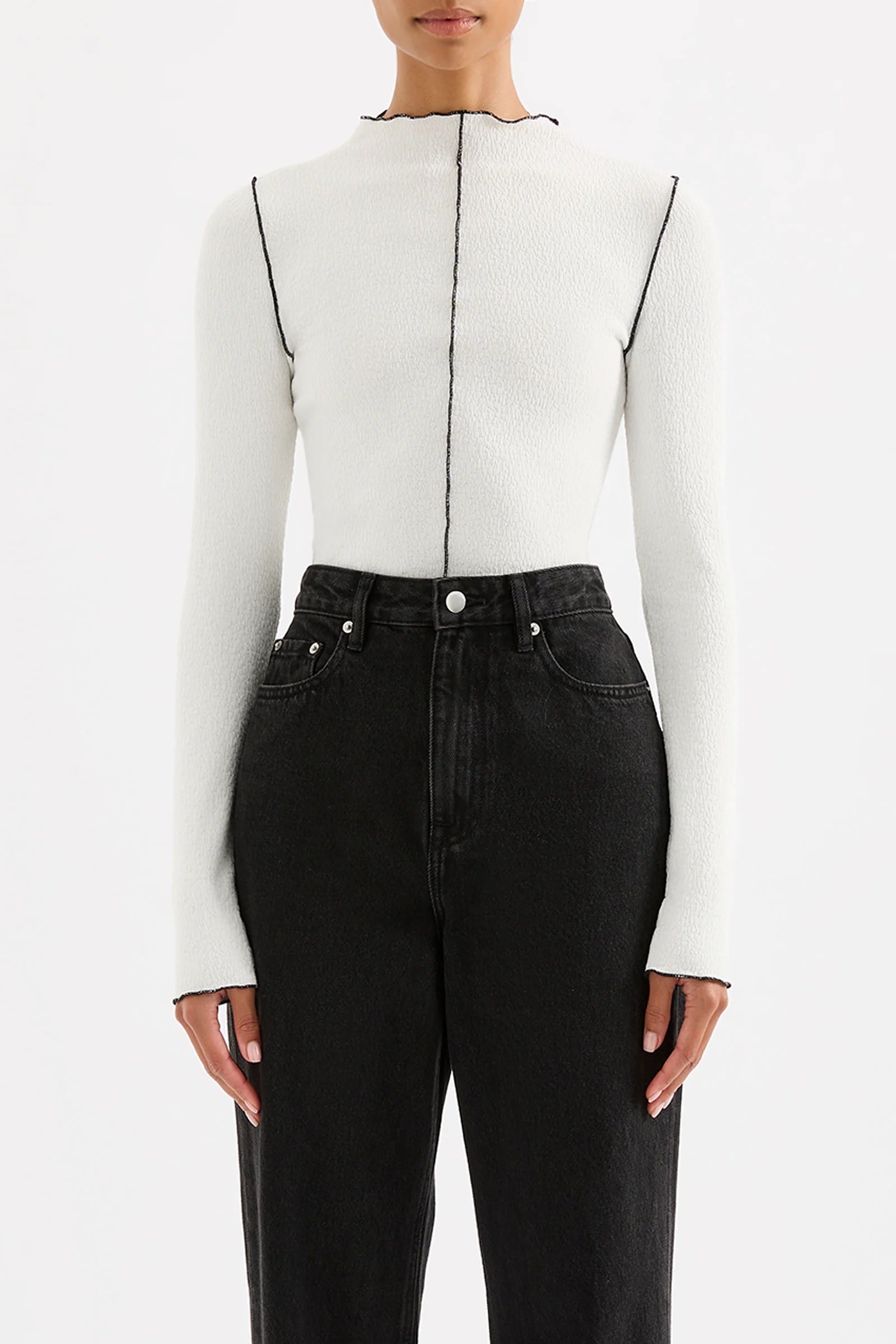 Made from a lightweight textured fabric that is stretchy and soft on the skin. The silhouette is a close fitting with length finishing at the hips. Features include a raised neckline, long fitted sleeves, and contrast baby locked neckline, centre front seam and hems.