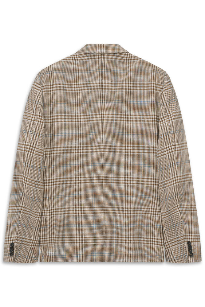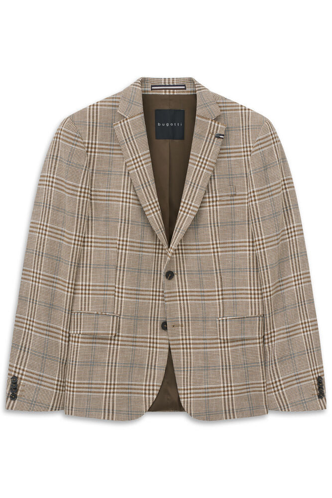 Notched lapel jacket with welt pockets, a chest pocket, and a clutch pin with a ribbon on the lapel, as well as side vents. Fully lined with stretch lining and color-coordinated accents through inside pockets and pleats. The garment is made from a cotton blend and features a harmonious glen check pattern with a contrasting overcheck.