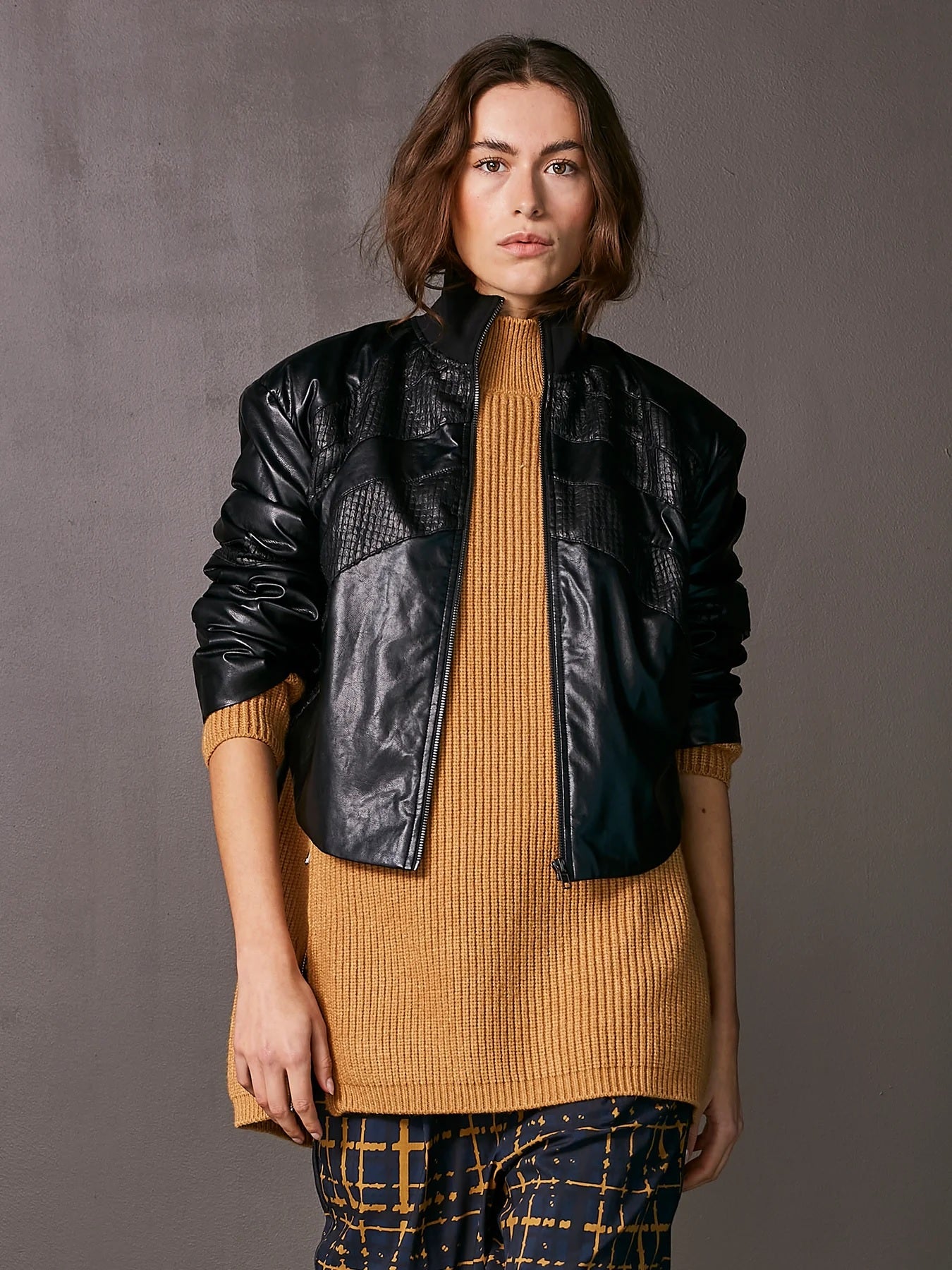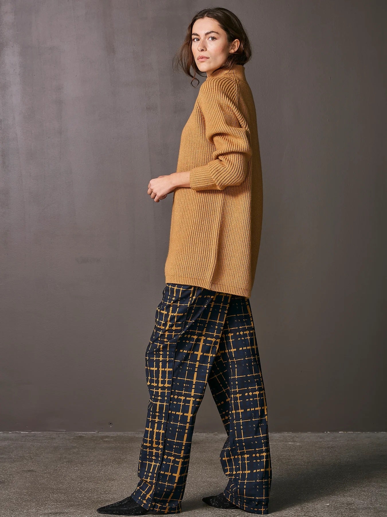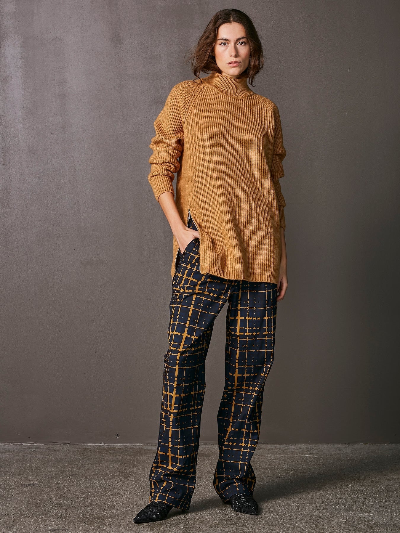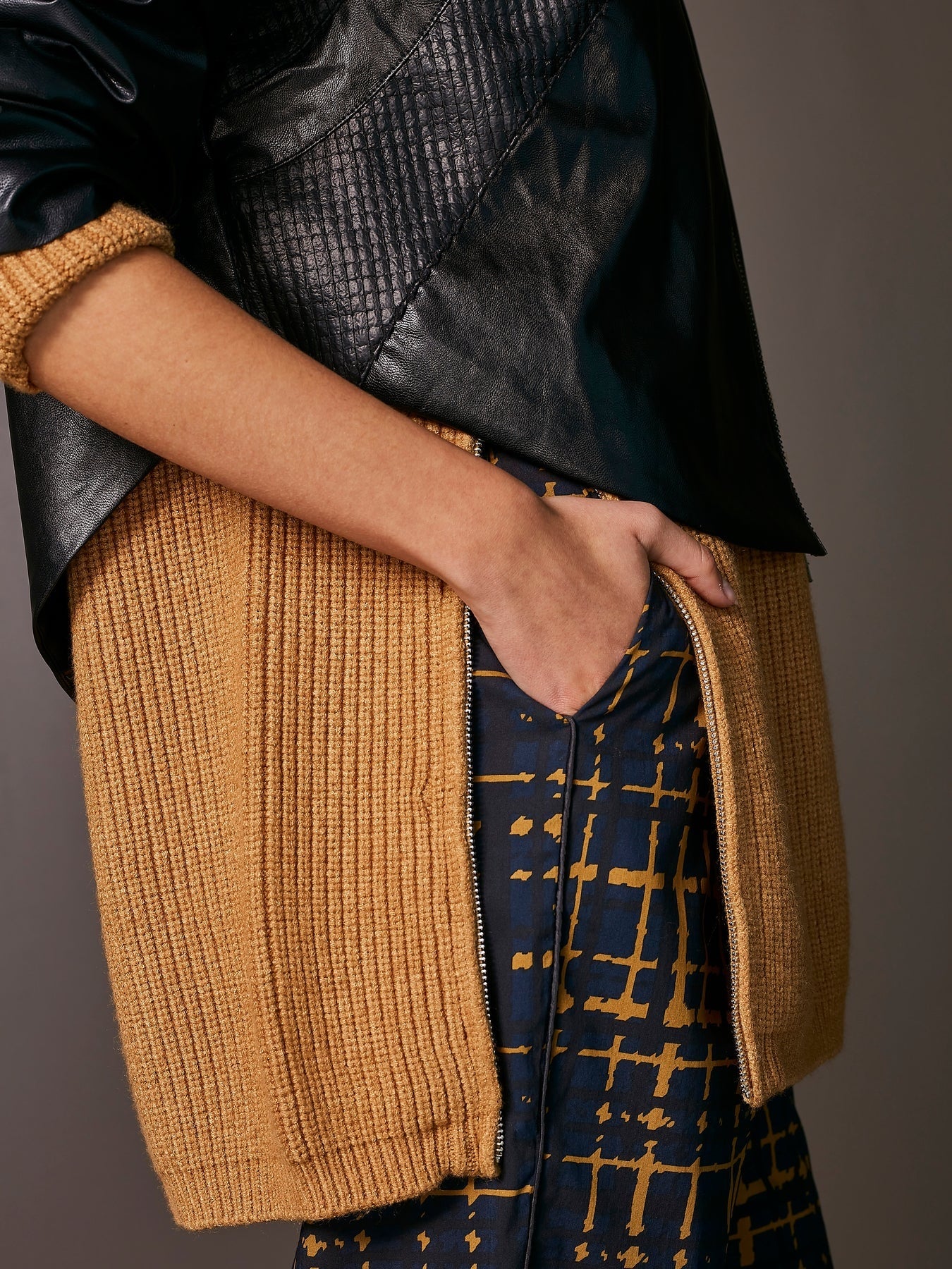 This knit sweater offers both comfort and style with its simple design and lightweight turtleneck. The rib-knit structure and relaxed fit make the sweater ideal for both everyday wear and casual gatherings. The side zipper adds a modern twist and allows for adjusting the fit. The back of the sweater is simple, offering a minimalist look.